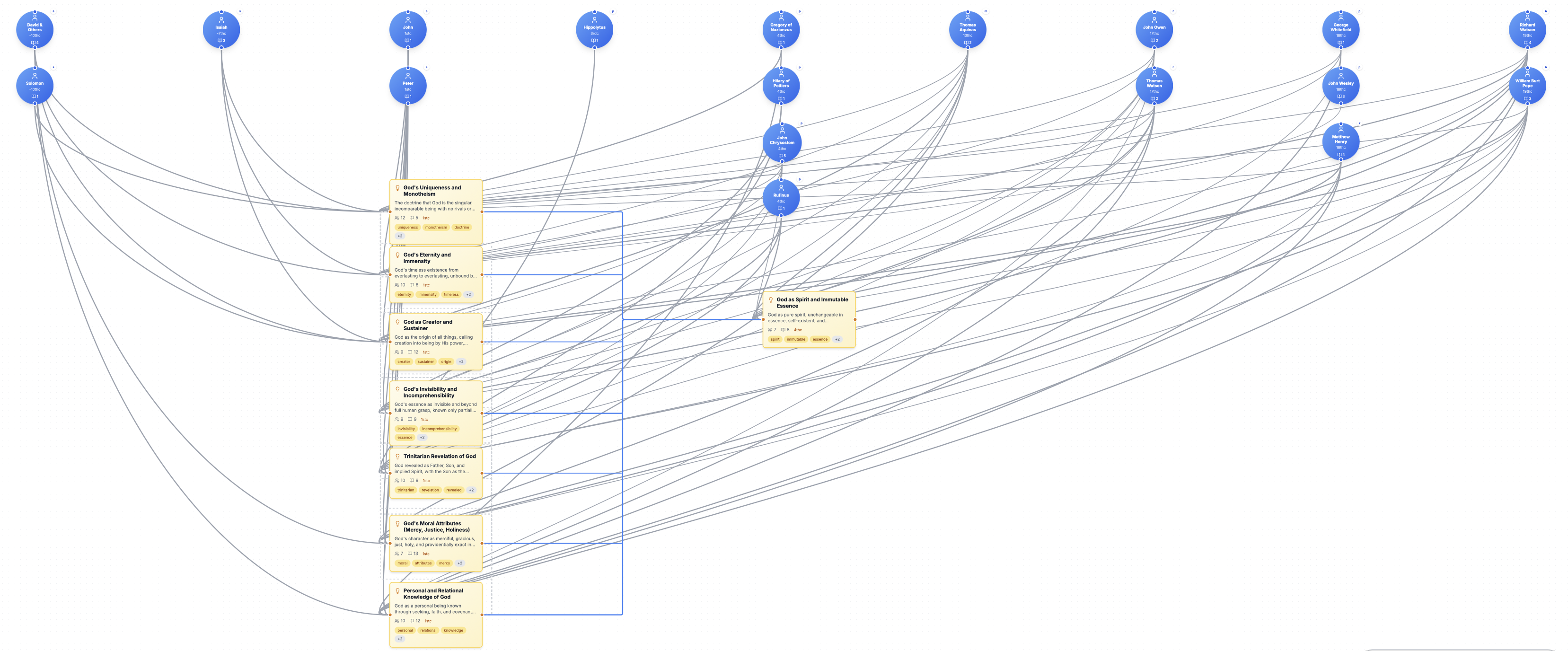 See the conversation behind the quotes. Build generates a visual graph showing how thinkers interacted over time—which authors addressed similar themes, how ideas developed across centuries, and where theological traditions converge or diverge.